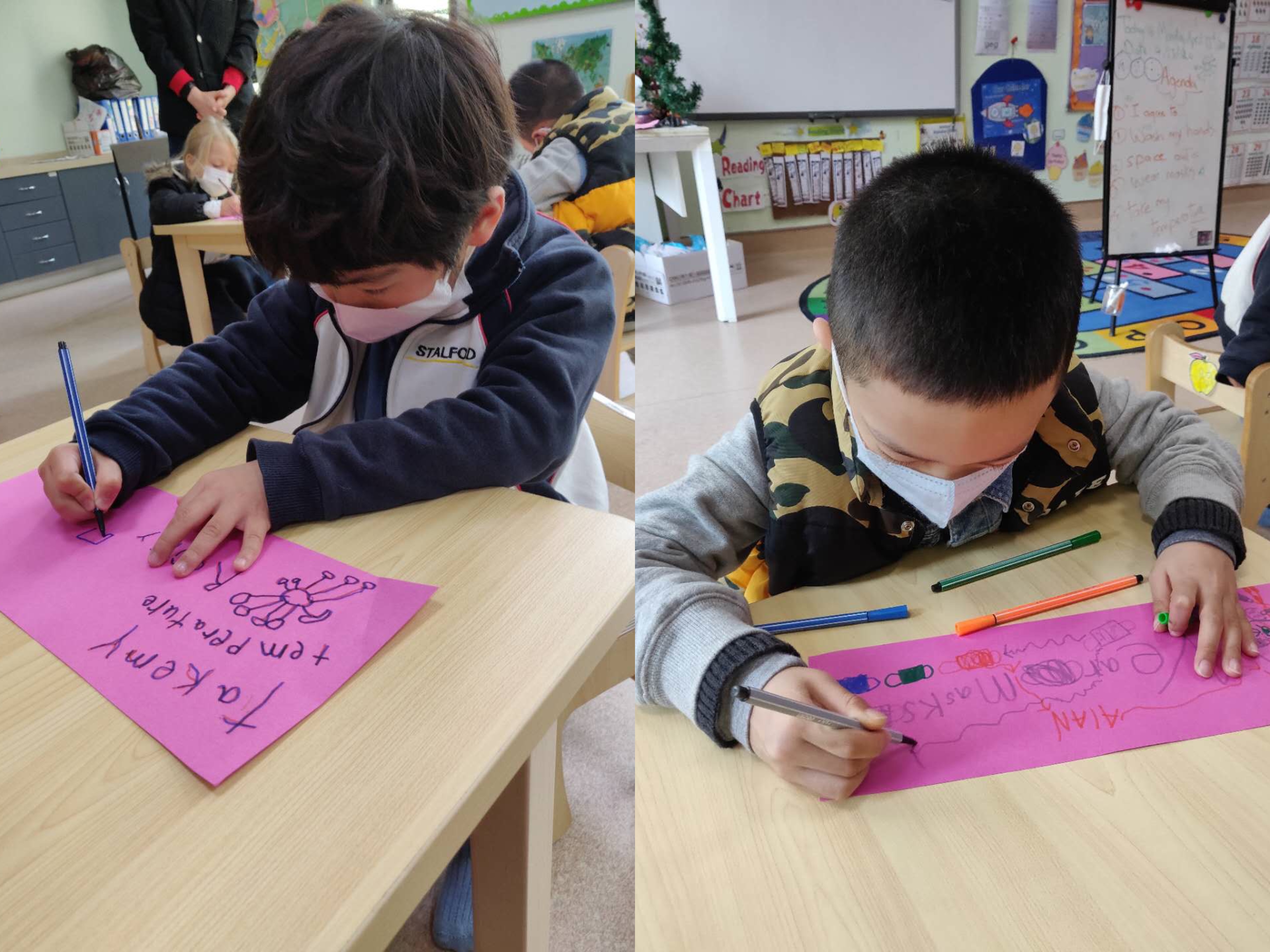 As our first day back together was Easter Monday, we celebrated with an egg hunt outside in a courtyard meadow. The children found not only chocolate, but fun words to put together to make sentences. They also revised their classroom agreements (aka rules) to include how to practice safe learning while at school during this outbreak time.