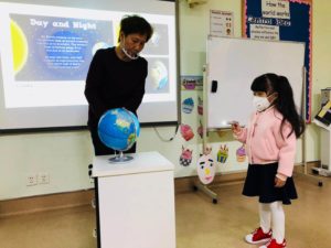Using a global and a torchlight (acting as the Sun) to illustrate the ‘Day & Night’ concept. Students learned that when the Earth rotates on its axis as it travels around the Sun; it is daytime on the side that faces the Sun and night on the other side. For better understanding of the concept, a ‘red dot’ was placed on the globe to indicate the spot of China is. The students noted that China was day time when the light shone on the ‘red dot’ and night time when no light shone on it.